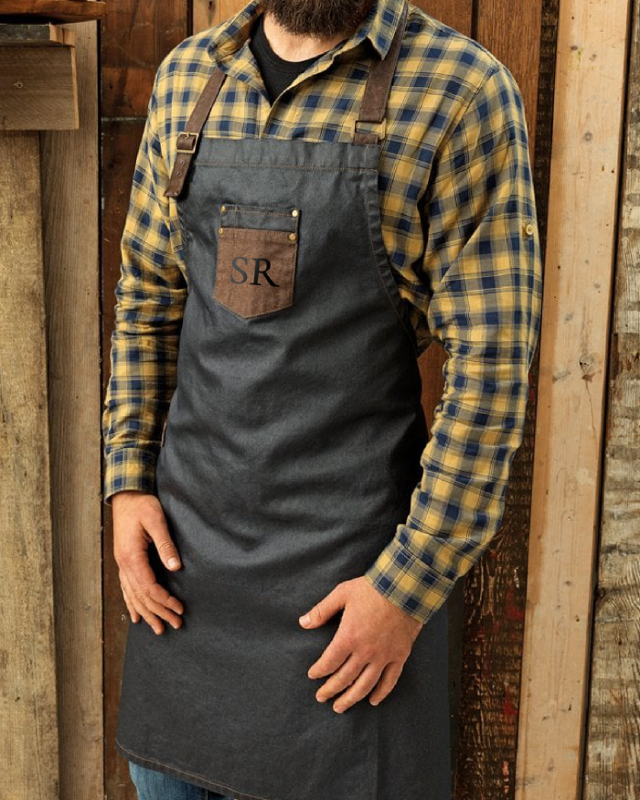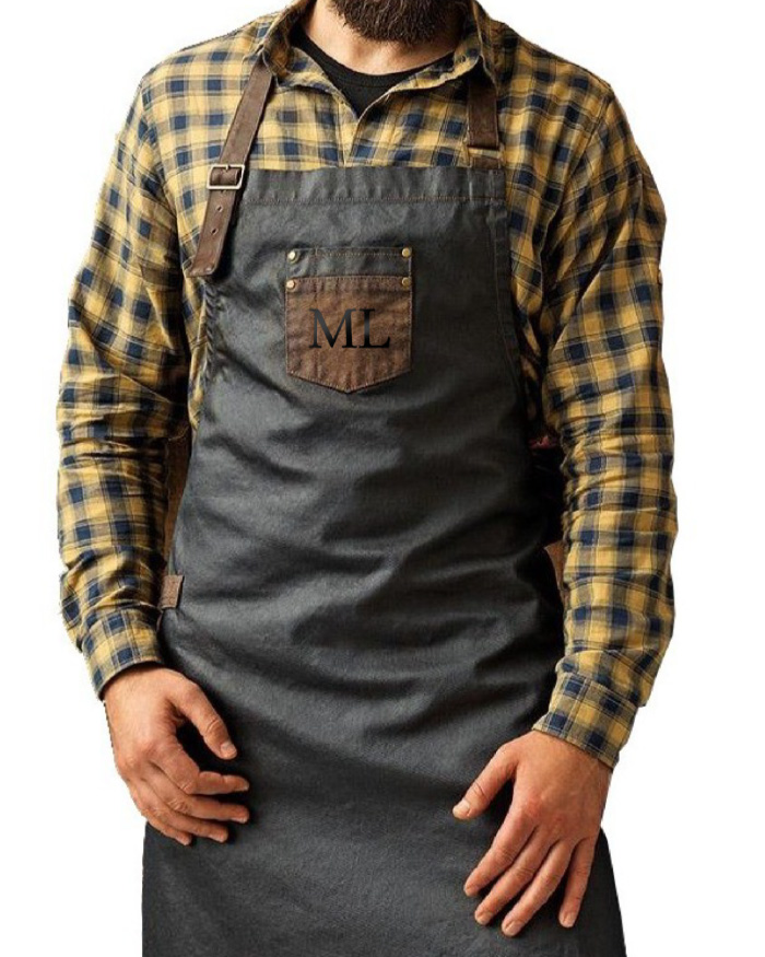 Grembiule in tela cerata con pettorina in pelle e chiusura regolabile, personalizzabile con iniziali.