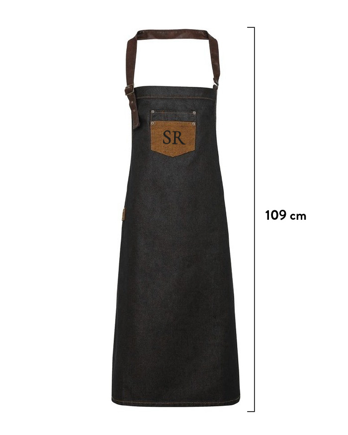 Il grembiule è realizzato in 100% denim di cotone e acrilico con effetto cerato con inserti in similpelle.