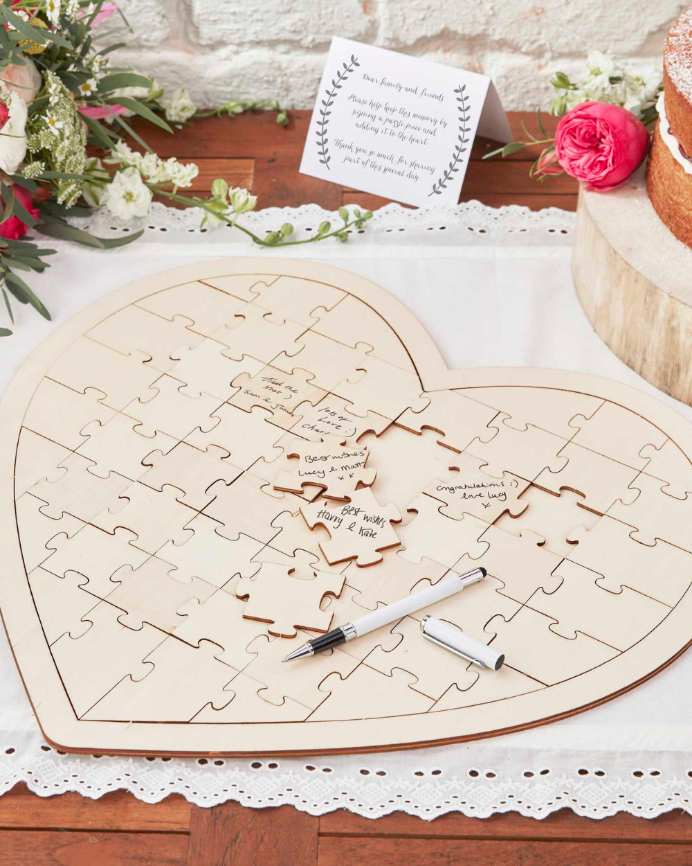 - Puzzle in legno: Ogni pezzo del puzzle può essere firmato e personalizzato dagli ospiti con un messaggio.