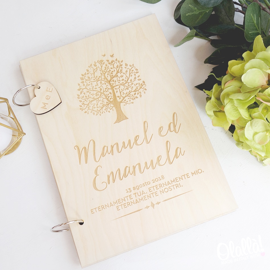 Meraviglioso guestbook in legno personalizzato con l’albero della vita, un cuoricino con le iniziali, i nomi della coppia e una dedica, ideale come regalo per l’Anniversario delle Nozze d’Oro. Riempito dei messaggi ed auguri speciali scritti a mano da amici, parenti ed altri invitati, sarà un modo splendido per permettere alla vostra coppia del cuore di conservare per sempre uno speciale ricordo di 50 anni di matrimonio.