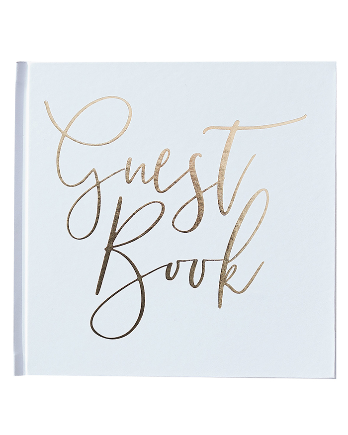 Pregevole guestbook in cartoncino bianco rigido, con raffinata scritta “Guest Book” in oro laminato. Sarà l’alleato perfetto per raccogliere le firme e i pensieri dei tuoi cari durante il vostro matrimonio! Da sfogliare una pagina per volta, per rivivere ogni istante del vostro giorno speciale attraverso i pensieri e le dediche dei vostri ospiti.
