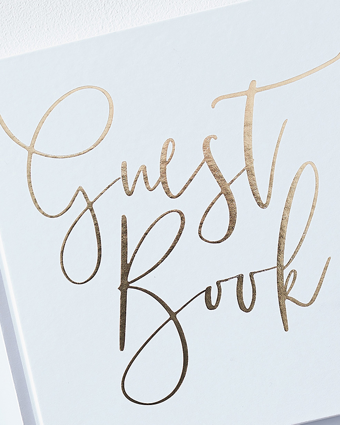 Guestbook in cartoncino rigido bianco, con scritta in oro laminato.