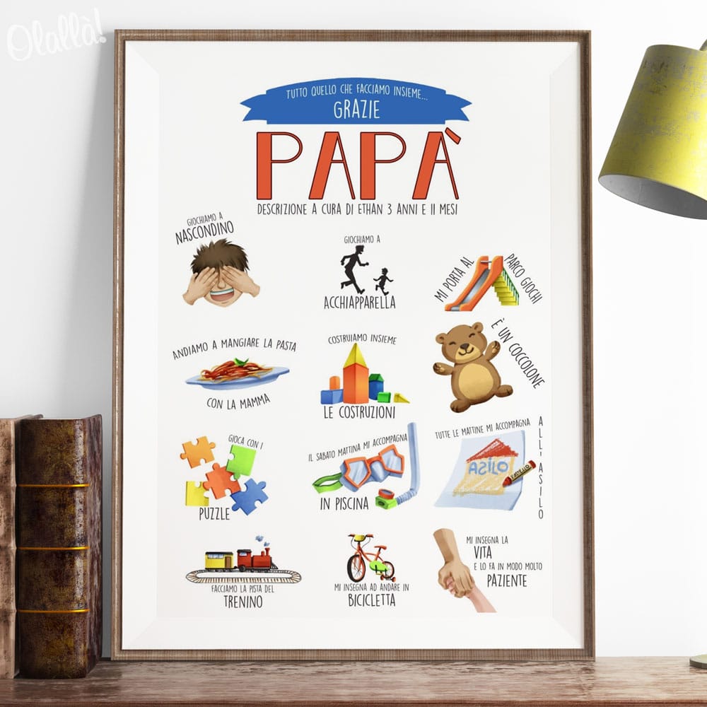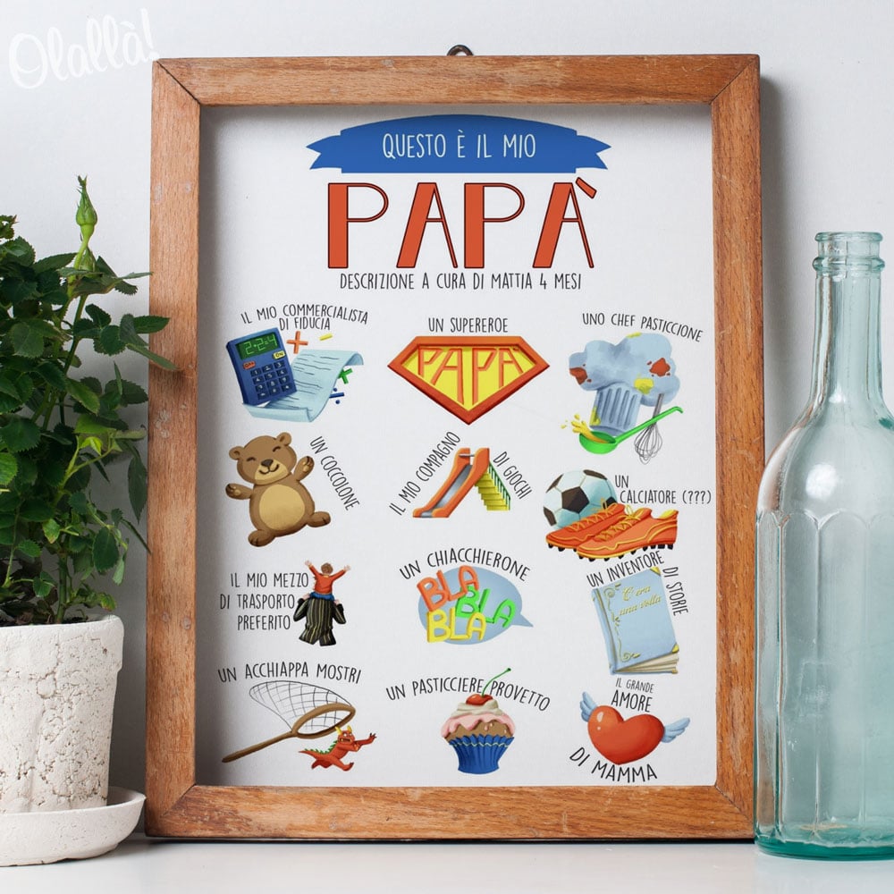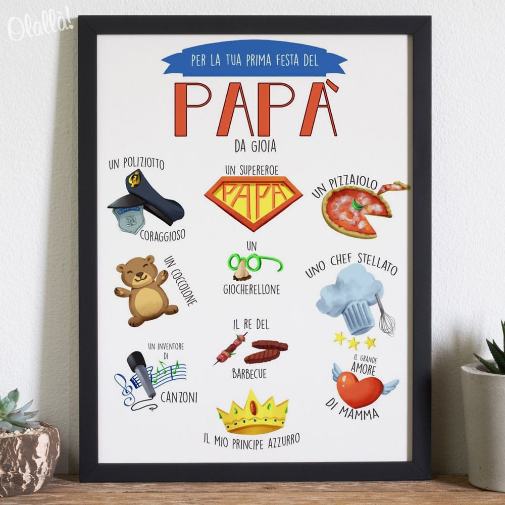 Meravigliosa illustrazione digitale personalizzata che ritrae i tanti aspetti che rendono ogni papà unico e speciale agli occhi del figlio. Una giovane e talentuosa illustratrice è pronta a trasformare le vostre idee in realtà e realizzare la vostra illustrazione. Perfetta come idea regalo per il compleanno o la festa del papà.