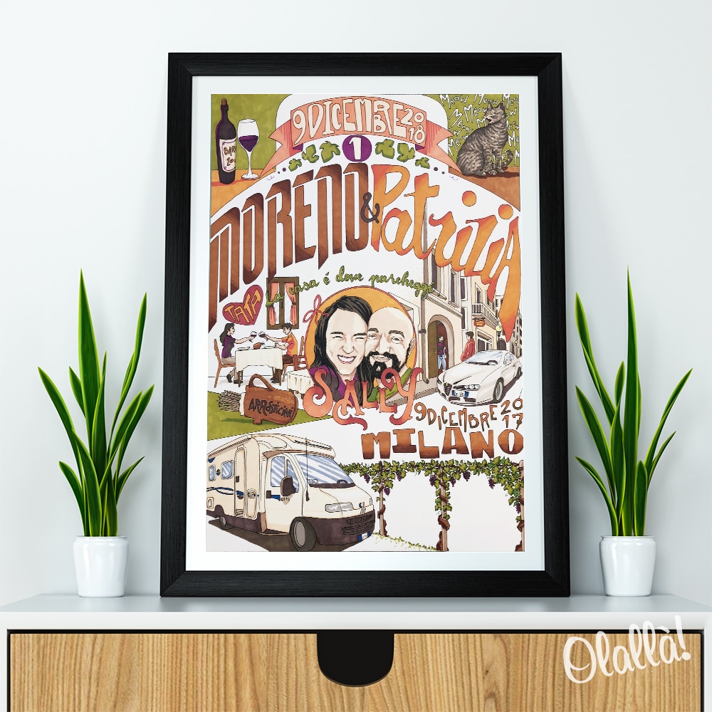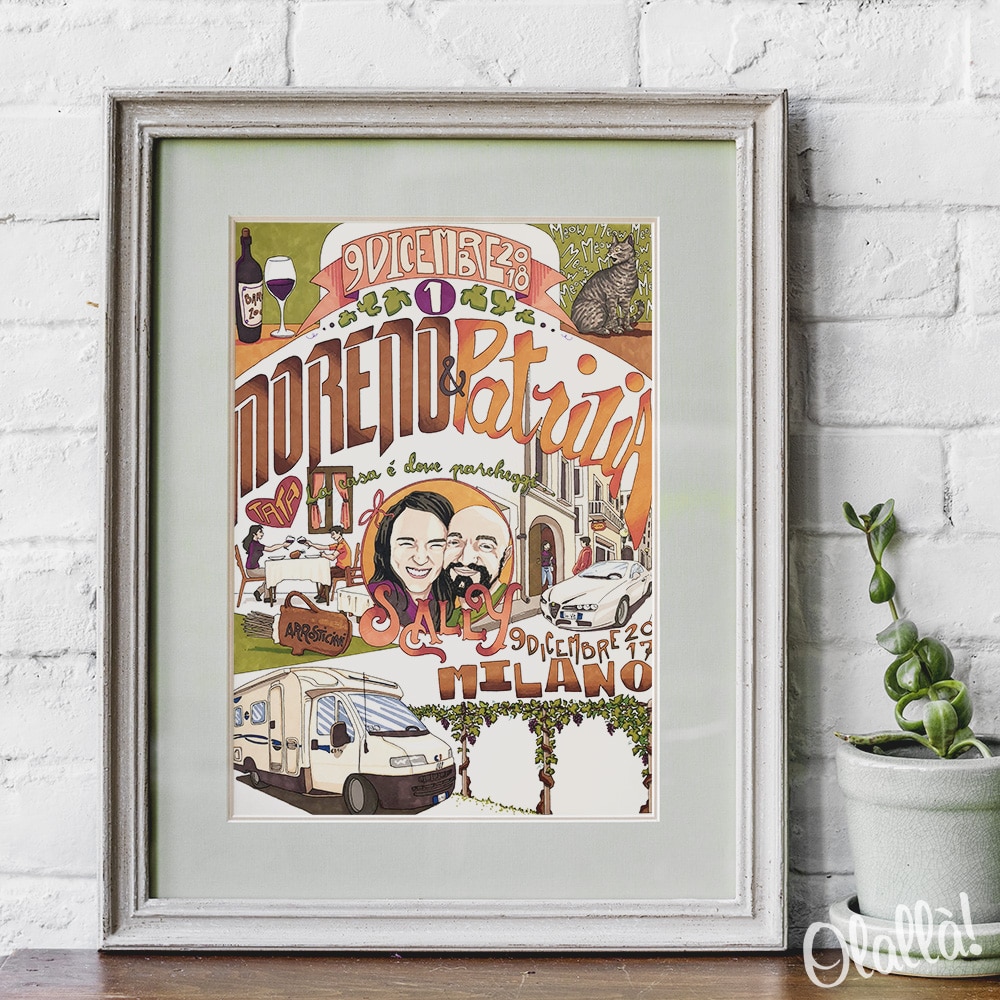 E’ necessario fornire all’illustratore gli elementi che sono richiesti. Quante più informazioni riuscirete a fornire, tanto più ricca risulterà l’illustrazione. L’illustratore, che lavora in formato digitale, cercherà di inserire quanti più elementi possibile. Le informazioni possono essere fornite SIA attraverso il sito, sia via WHATSAPP: una volta completato l’acquisto verrete messi in contatto via whatsapp (se lo desiderate) con l’illustratore che vi terrà informati sullo stato di avanzamento dell’illustrazione. Una volta reperite tutte le informazioni necessarie, verrà creata una prima bozza. Se tutto va bene, si procederà con la colorazione. Una volta il disegno confermato, verrà stampato nei nostri laboratori e spedito. Il prodotto NON prevede l’aggiunta di una cornice.