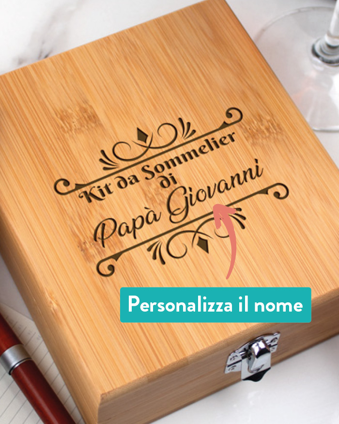 • PER IL PAPÀ CHE AMA IL VINO: un vero sommelier non può non avere in casa un set di accessori per il vino. Con questa elegante box da sommelier personalizzabile, in legno di bamboo e zinco, il tuo papà potrà replicare gli eleganti gesti di un vero e proprio sommelier professionista, per un’esperienza da ristorante stellato a casa vostra!