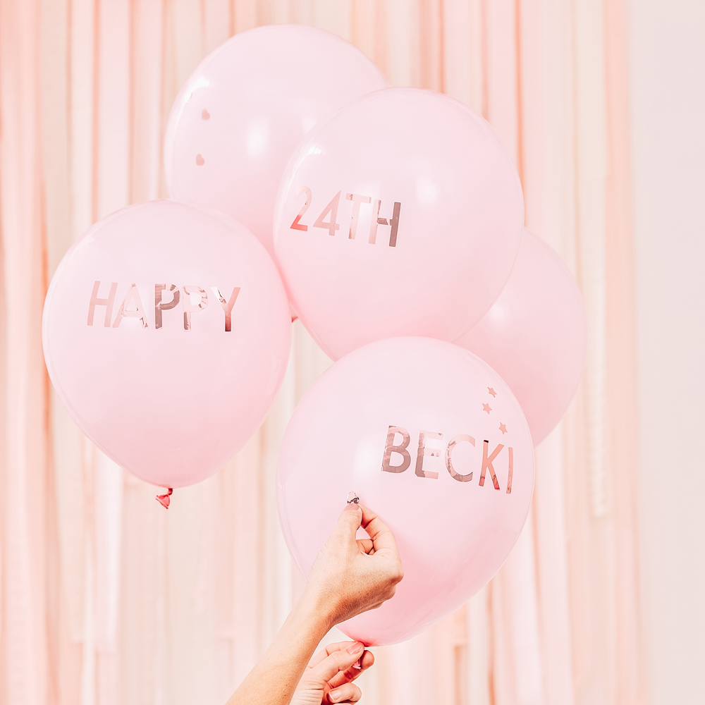 Fantastico set di Palloncini Rosa e Rose Gold Personalizzabili, perfetti per decorare le tue feste di compleanno! In dotazione vengono anche forniti degli adesivi con lettere e numeri, per scrivere dei messaggi d’auguri sui palloncini e rendere decisamente unica la tua festa!