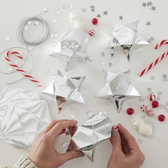Fai un conto alla rovescia davvero sorprendente con questo magico calendario dell’avvento a forma di stelle argentate da appendere a piacimento. Costruisci a casa le stelle e completale con gli adesivi con il numero del giorno, poi riempile con dolcetti o mini regalini da far aprire ogni giorno a chi vuoi tu! Bellissima idea se appese all’albero di Natale o disposte su una mensola, per aggiungere un tocco luccicante e magico alla tua casa questo Natale! In ogni pacco troverai 24 scatoline e un foglio di adesivi. Le stelle misurano 12×12 cm.
