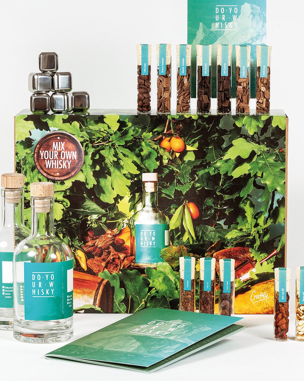 12 provette riempite con 3 tipi di trucioli di legno e 6 sostanze botaniche selezionate a mano, 6 pregiate pietre da whisky in acciaio inox, 2 bottiglie di vetro in batch con tappi di legno ed etichette per l’etichettatura individuale.