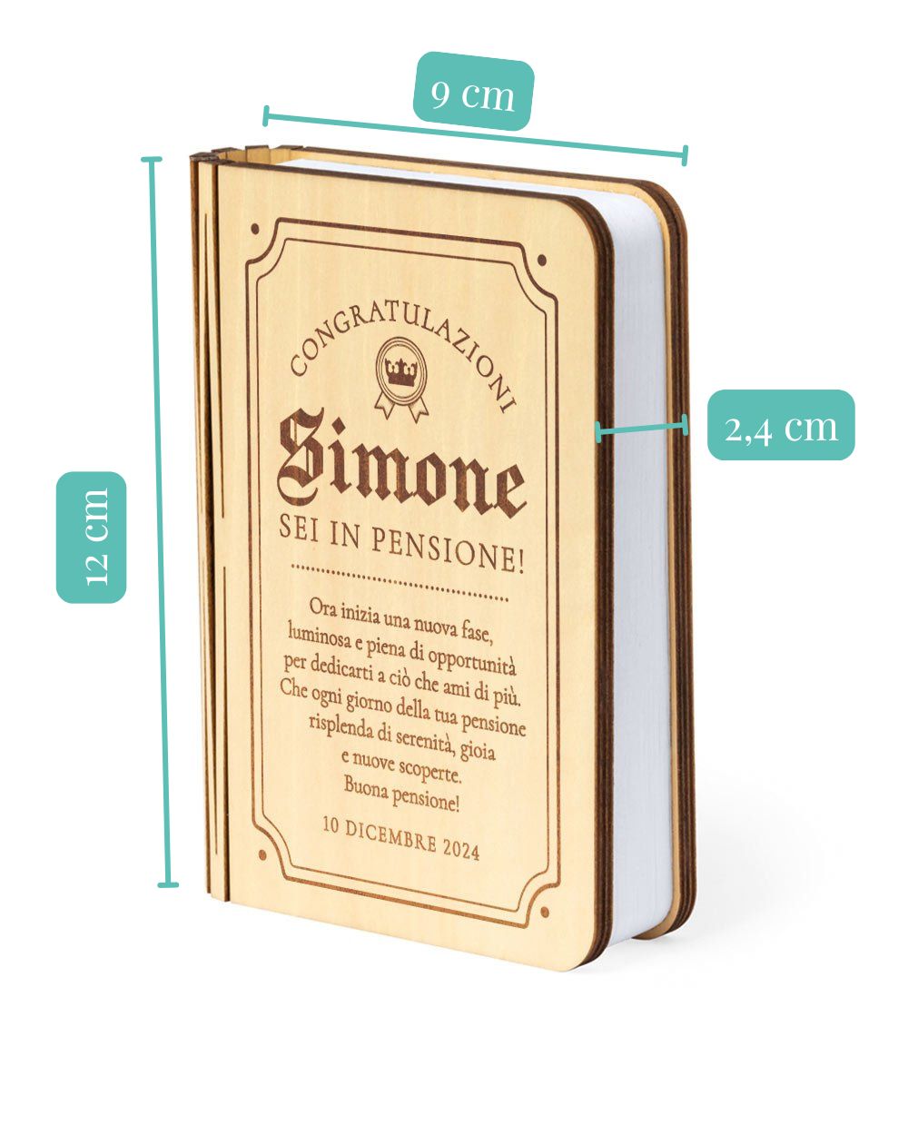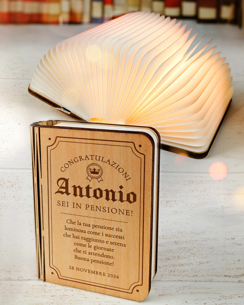 Cerchi un regalo unico e indimenticabile per una persona che è andata in pensione? La nostra Lampada a Libro Personalizzata con Nome, Dedica e Data è la soluzione perfetta. Questa originale lampada LED a forma di libro è tanto pratica quanto affascinante, combinando design elegante e funzionalità. Realizzata in legno, si apre per rivelare un interno che simula realisticamente i fogli di carta, illuminati da 16 LED luminosi ma delicati.