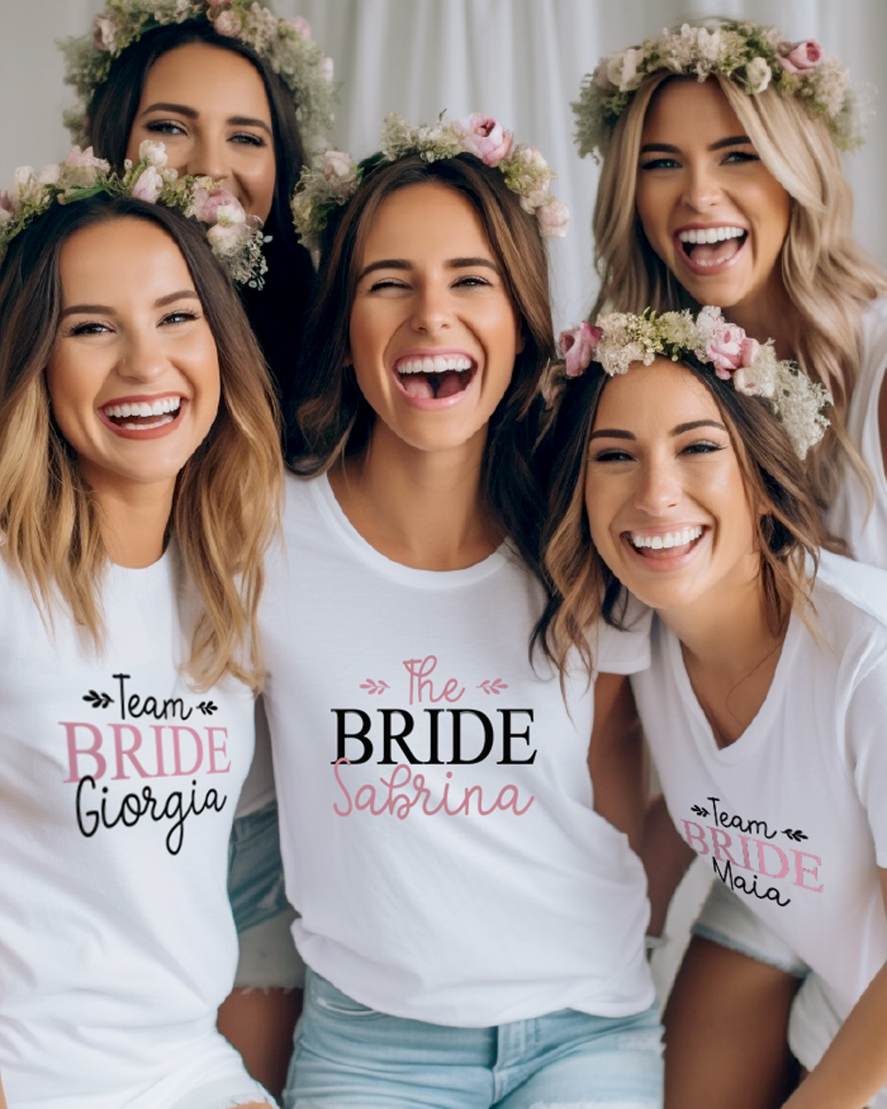 Se stai cercando l’abbigliamento perfetto per celebrare l’addio al nubilato della tua amica, la Maglietta T-Shirt “Team Bride” personalizzata con il nome dell’amica della sposa è l’idea regalo ideale. Questa t-shirt non solo rende omaggio all’amicizia, ma aggiunge un tocco di glamour e divertimento alla giornata speciale, unendo il gruppo di amiche in un look coordinato e memorabile.