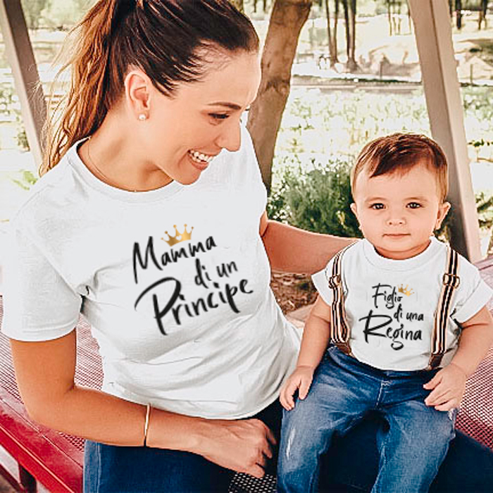Bellissima coppia di magliette personalizzate per mamma e figlia o figlio con la scritta “Mamma di un Principe” e “Figlio di una Regina” Personalizzabile scegliendo le frasi da scrivere nelle due magliette, questa t-shirt sarà perfetta per tutte le super-mamme là fuori.