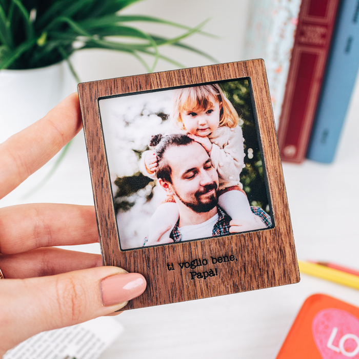 Sorprendi il tuo papà nel giorno della sua festa con questa carinissima calamita da frigo! Scegli la finitura della cornice e indica la frase che vuoi far incidere; carica la tua foto e il gioco è fatto! È un regalo sicuramente emozionante e gradito in occasione del 19 marzo.