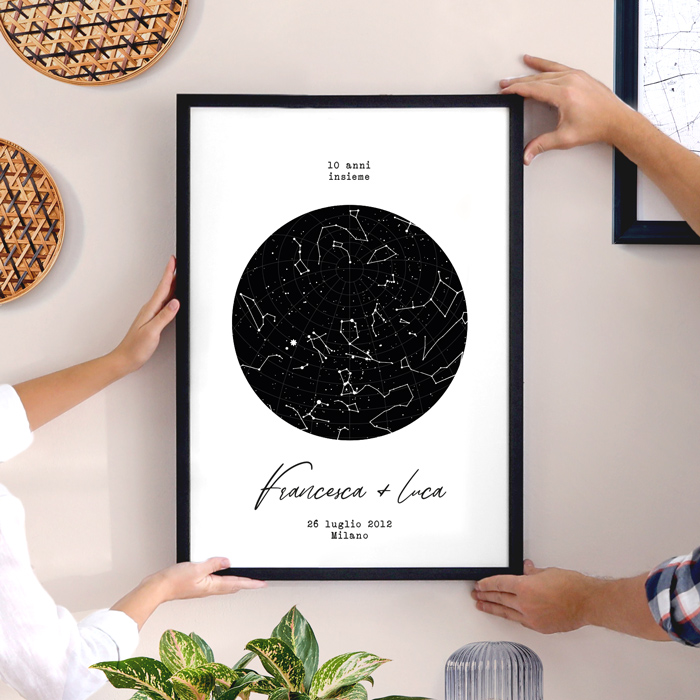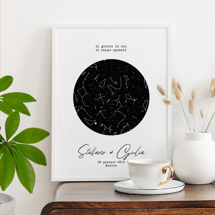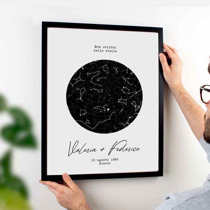 Bellissima Mappa Stellare Personalizzata con Nomi e Dedica. Hai mai pensato a com’era il cielo il giorno che vi siete incontrati? O quella sera in cui vi siete scambiati il primo bacio? Ora puoi scoprirlo: basta indicare il giorno e il luogo e creeremo la mappa del cielo stellato che è stato testimone dei tuoi momenti speciali. Regala un’emozione unica in occasione del vostro primo anniversario o di san Valentino, il tuo lui o la tua lei rimarranno senza parole, come proprio davanti al firmamento!