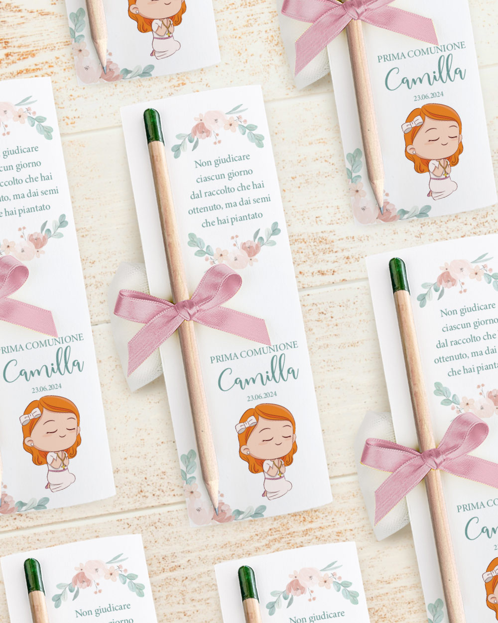 - Personalizzazione: Ogni matita può essere personalizzata con una dedica, intestazione, il nome della bambina, la data dell’evento, e abbellita con eleganti decori floreali. Questo livello di personalizzazione non solo le rende uniche, ma anche un ricordo duraturo di un momento significativo.