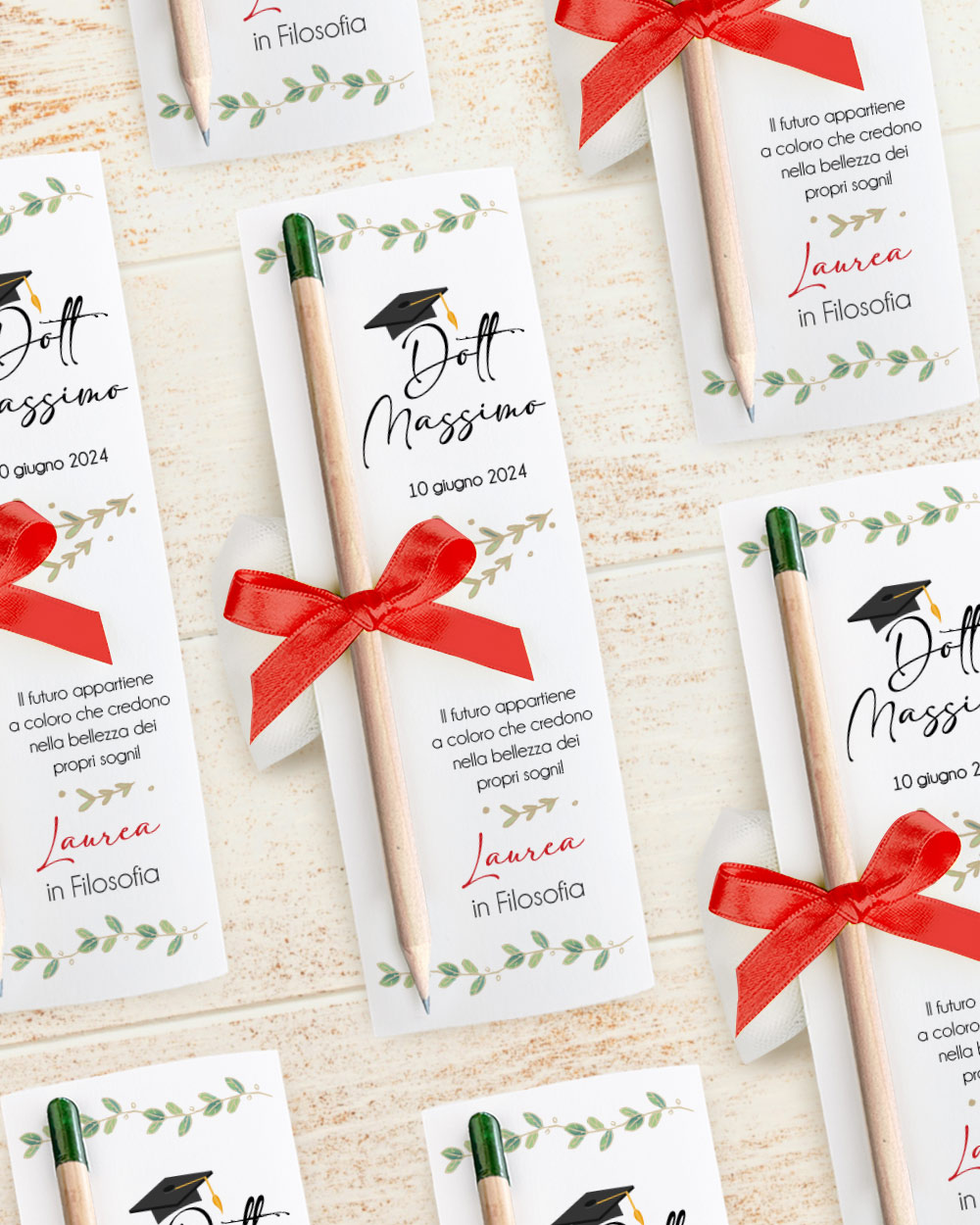 - Personalizzazione Raffinata: Ogni matita può essere personalizzata con il nome del laureato, la data della cerimonia, una dedica personale, e una elegante intestazione con alloro, simbolo tradizionale di successo accademico. Questo dettaglio le rende un ricordo unico e prezioso di questo traguardo importante.