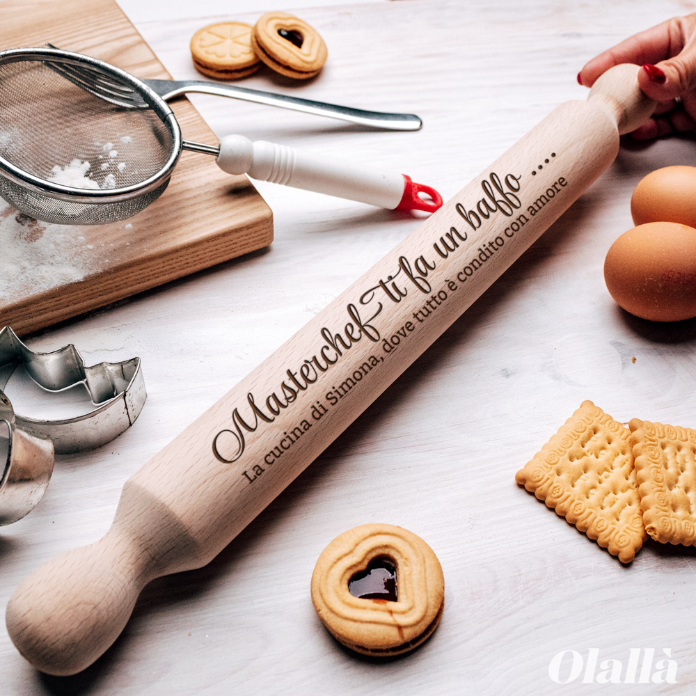 Bellissimo mattarello in legno di faggio personalizzato con la frase “Masterchef ti fa un baffo” e la tua dedica. Una originale idea regalo natalizia per chi ama cucinare!