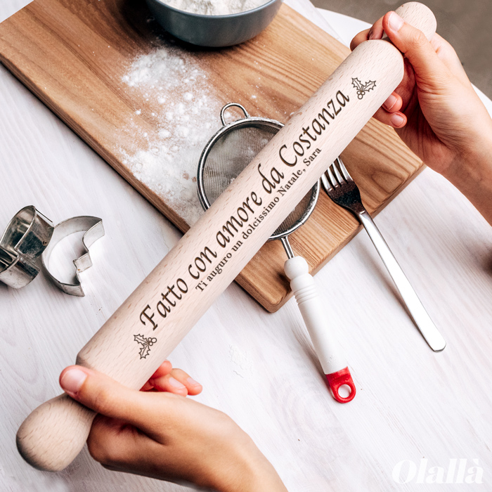 Splendido mattarello in legno di faggio personalizzato con la tua dedica incisa e abbellito da decorazioni natalizie. Una originale idea regalo da fare a una persona del cuore che ama impastare e cucinare ottimi manicaretti!