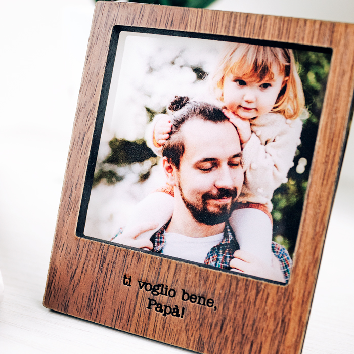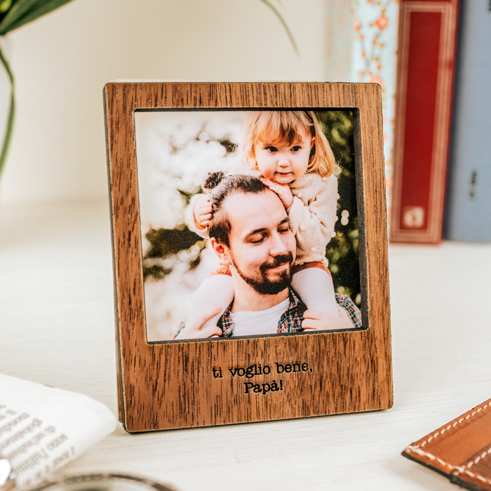 Sorprendi il tuo papà nel giorno della sua festa con questa carinissima mini cornice da tavolo! Scegli la finitura della cornice e indica la frase che vuoi far incidere; carica la tua foto e il gioco è fatto! È un regalo sicuramente emozionante e gradito in occasione del 19 marzo.