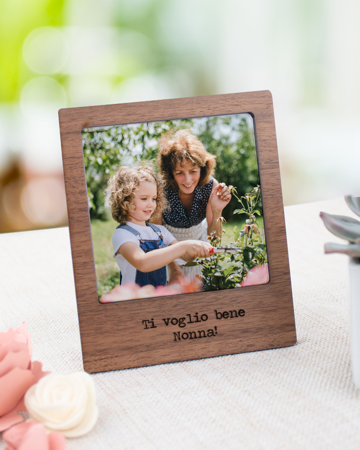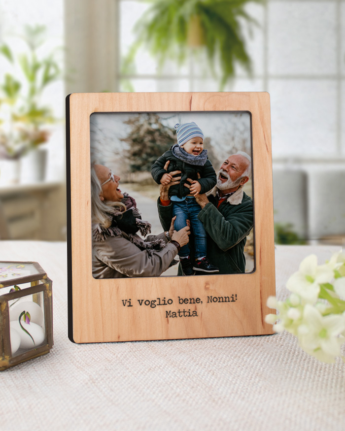 Sorprendi i tuoi nonni con questa carinissima mini cornice da tavolo! Scegli la finitura della cornice e indica la frase che vuoi far incidere; carica la tua foto e il gioco è fatto! È un regalo sicuramente emozionante e gradito in occasione della festa dei nonni.