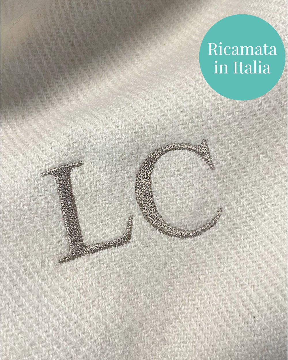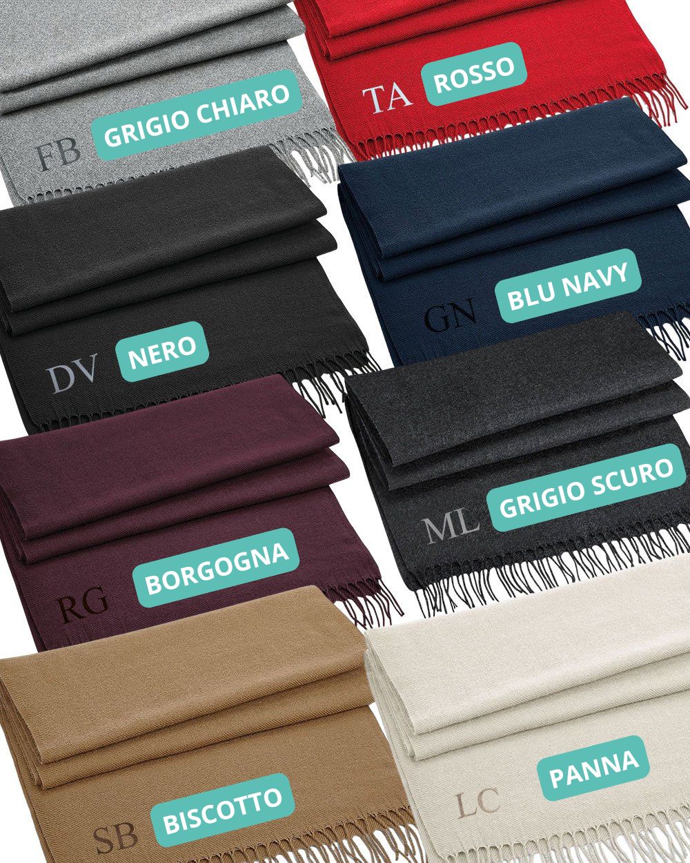 Colori: scelta tra diversi colori disponibili. Le iniziali vengono ricamate in un colore simile al colore stesso della sciarpa per avere un effetto ton sur ton.