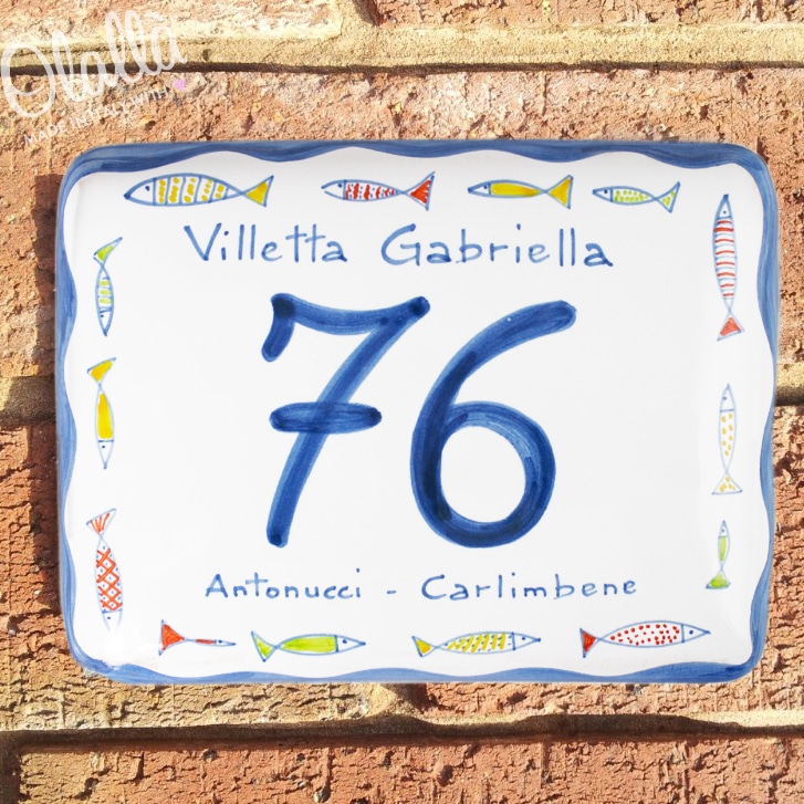 Meravigliosa formella in ceramica lavorata e dipinta a mano, da una bravissima artigiana bolognese. Questo prodotto 100% made in Italy vi garantisce qualità e resistenza, con una garanzia di 20 anni. La piastrellina infatti resiste a sole, gelo e intemperie, provare per credere! Puoi personalizzarla come preferisci, sfruttandola come numero civico (come da esempio) o decidendo di inserire via, nome di famiglia, comune ecc. Puoi anche scegliere la calligrafia della scritta e il colore che più si addice alla tua casa. Tieni presente però che i colori potrebbero variare rispetto a quelli della foto, a causa della luce e del tipo di schermo, cosa che garantisce la totale artigianalità del prodotto. Ottima anche come idea regalo!