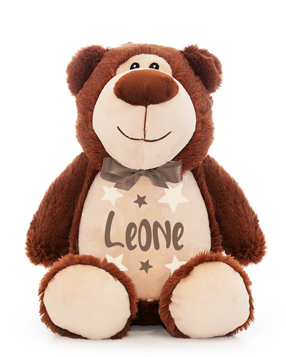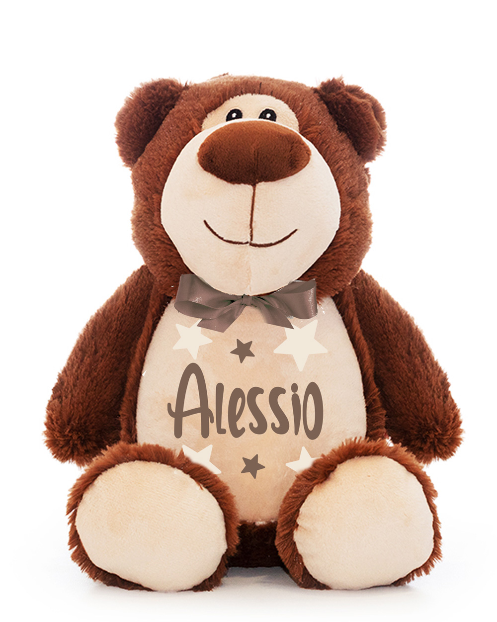 Questo adorabile peluche orsetto personalizzato rappresenta un pensiero speciale e unico per occasioni memorabili. Il nome, scritto in un simpatico carattere nei toni del marrone, è adornato da stelle marroni e panna.