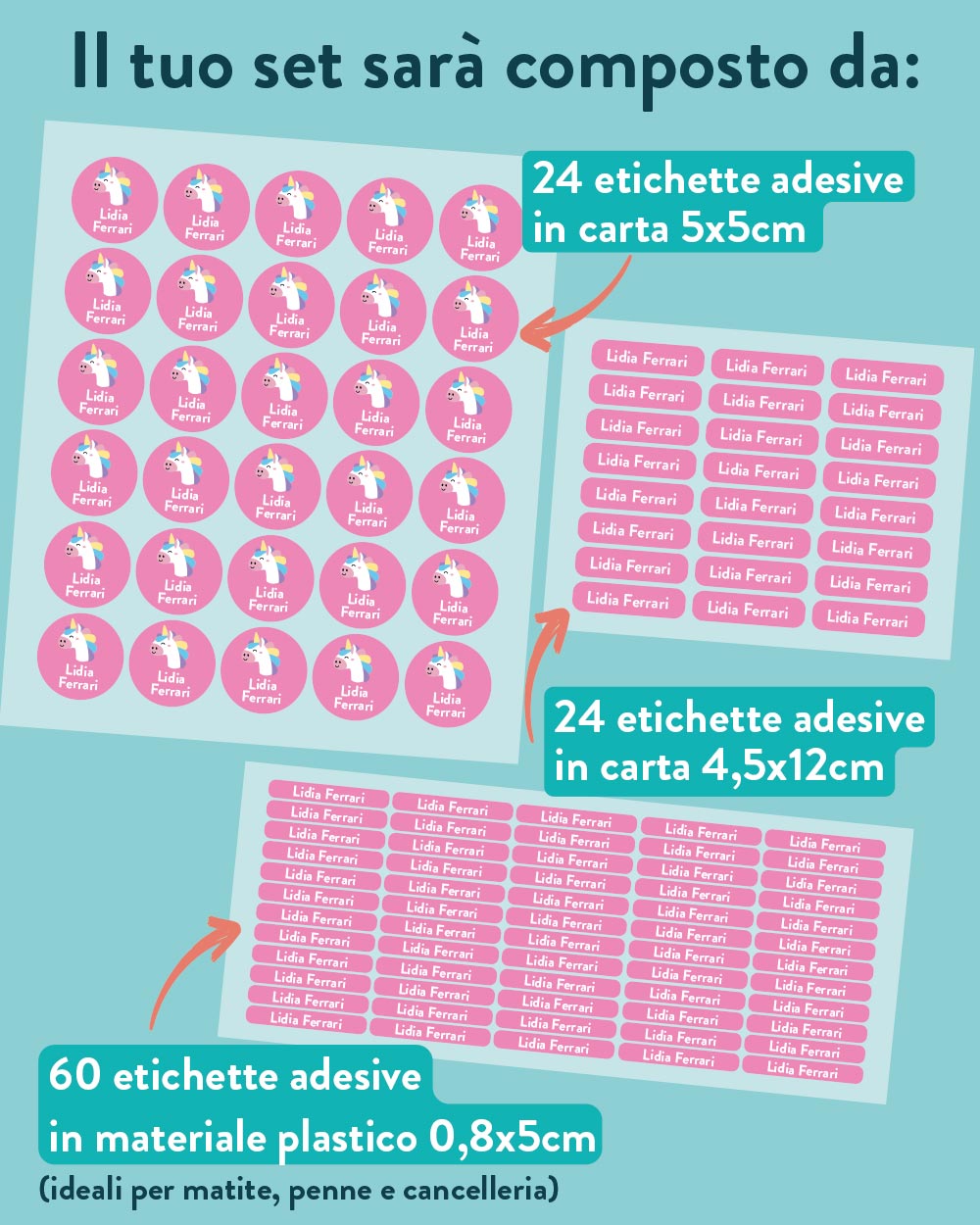 2. Personalizzazione Totale: le etichette sono personalizzabili con il nome del bambino, il colore preferito e un simbolo divertente. Questo non solo aiuta a identificare il materiale scolastico, ma aggiunge anche un tocco personale che renderà ogni etichetta unica e speciale.