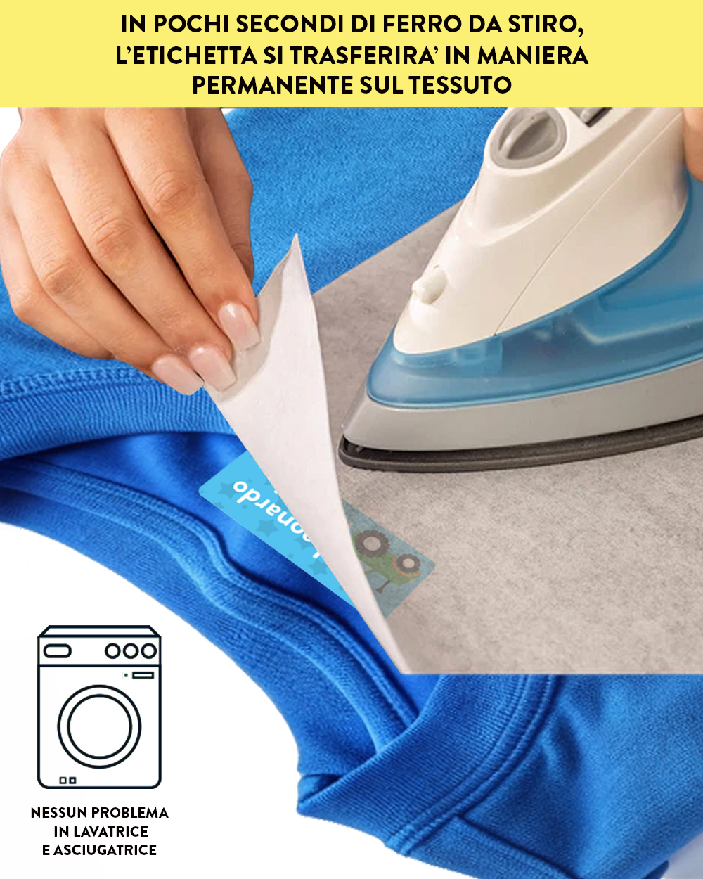 - Istruzioni di lavaggio: lavare i capi con etichette termoadesive applicate preferendo un ciclo di lavaggio delicato a 40° ed evitando la candeggina o detergenti aggressivi. Inoltre, è possibile asciugare i capi anche in asciugatrice, senza rovinare la qualità dell’etichetta.