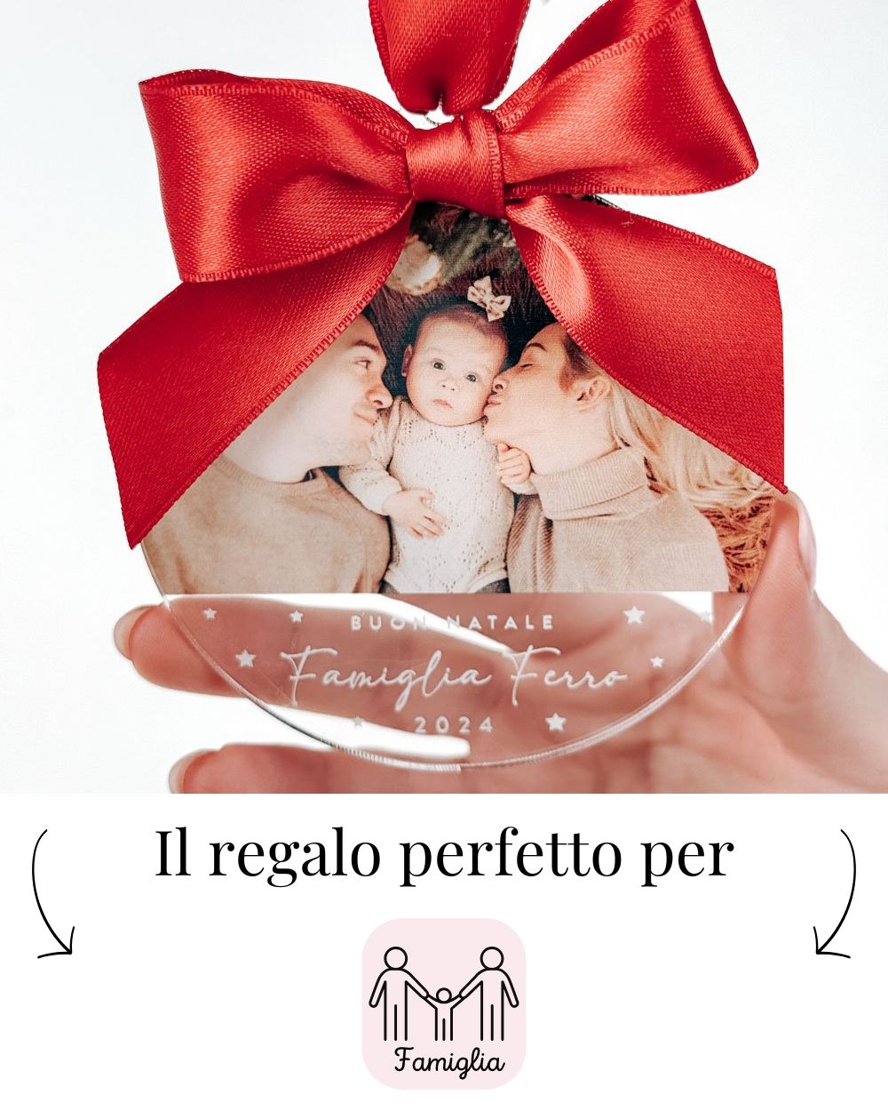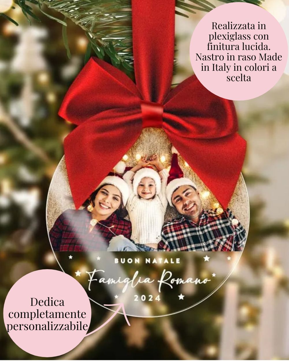 Scegli la foto che desideri e aggiungi una dedica o il nome della famiglia. Grazie alla nostra tecnologia avanzata, la stampa sulla pallina è precisa e duratura, garantendo che la tua immagine rimanga perfetta per molti Natali a venire. La personalizzazione rende ogni pallina unica e speciale, un regalo fatto su misura per chi ami. - Fiocco personalizzabile in vari colori