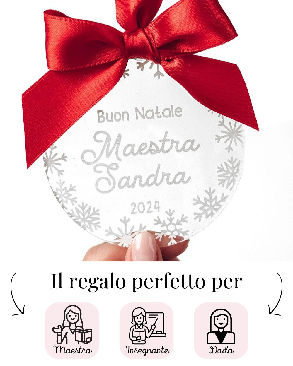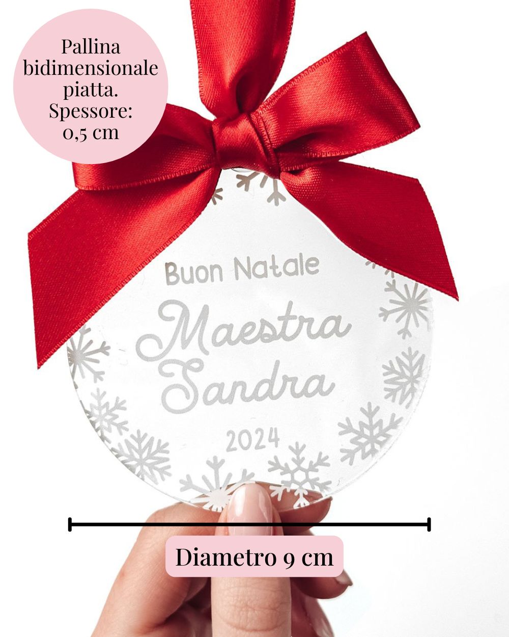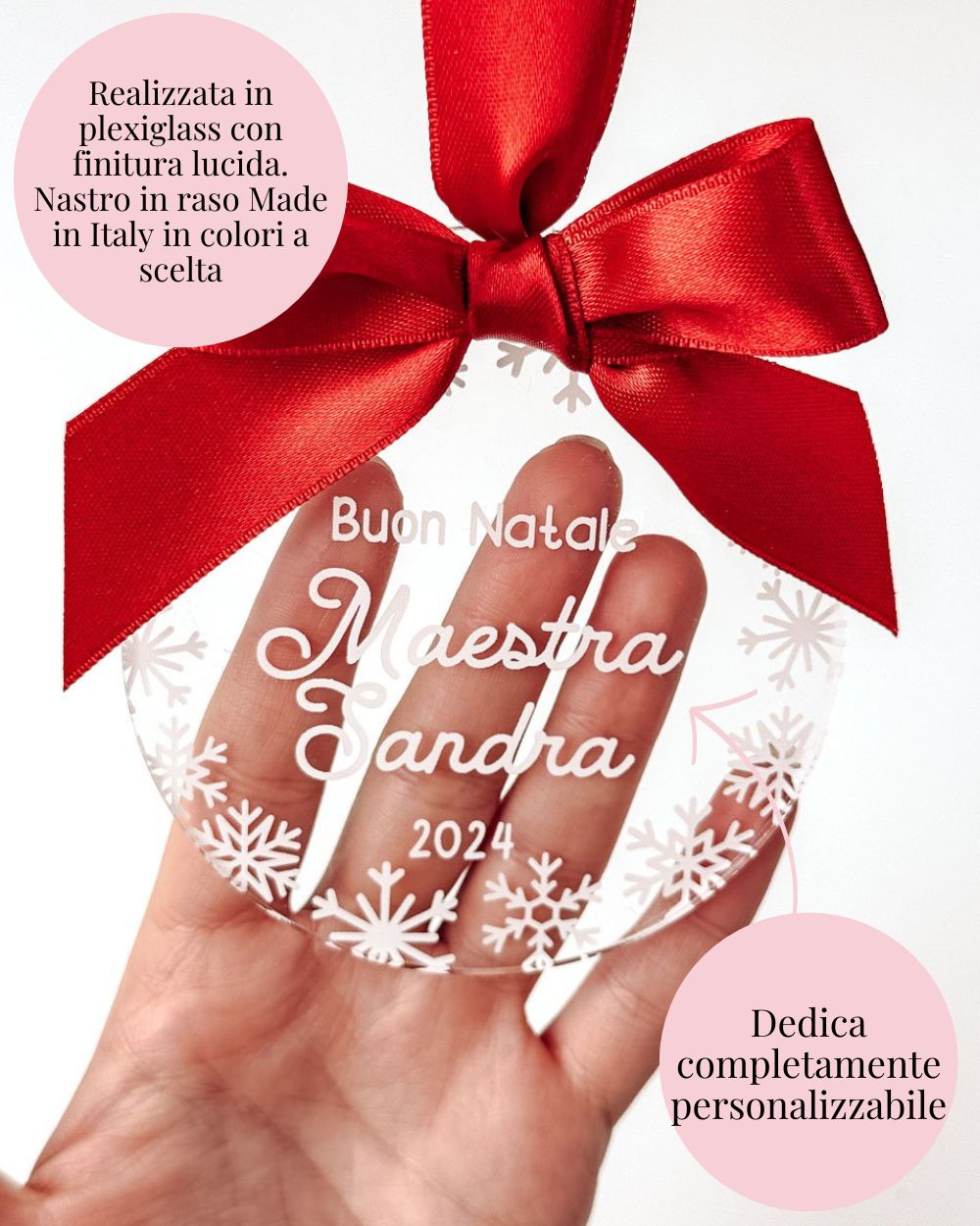 Deliziosa Pallina in Plexiglass stampata con nome e dedica per la tua maestra. Una pallina davvero deliziosa per omaggiare la maestre del lavoro svolto! In questa versione ti proponiamo la frase “Buon Natale Maestra” ma può essere modificata a piacimento.
