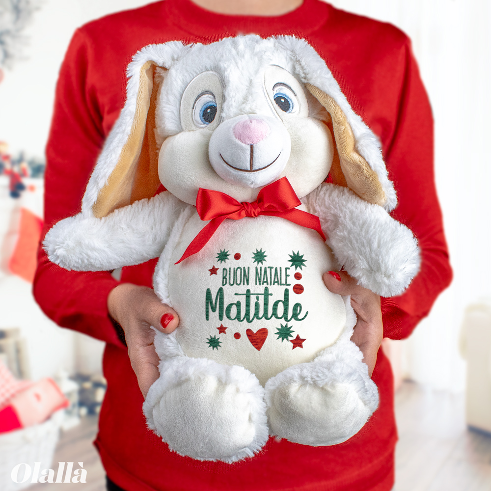Dolcissimo peluche natalizio con scritto “Buon Natale” sul pancino e personalizzato col ricamo del nome del tuo piccolino. Il regalo di Natale perfetto per far felici i tuoi cuccioli !