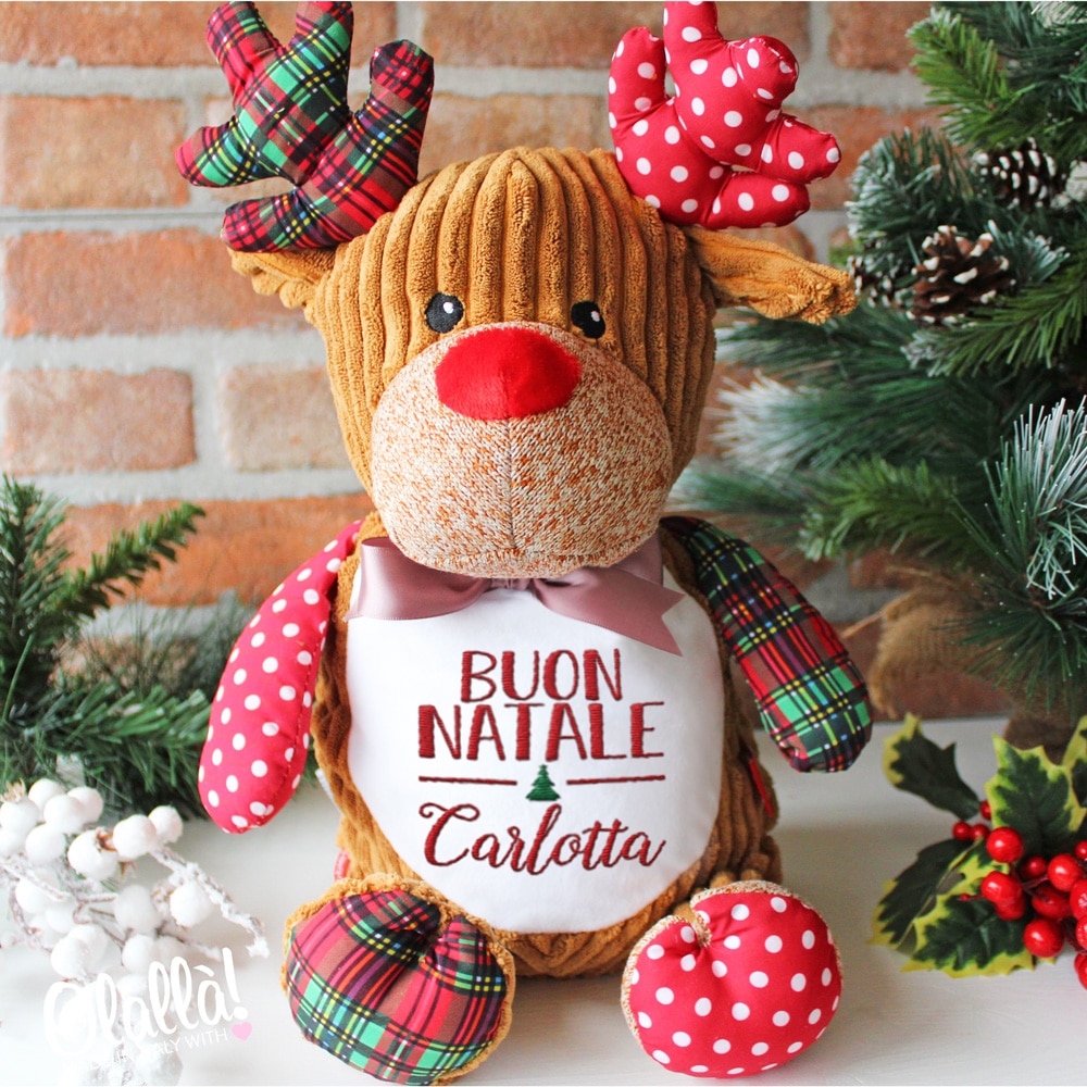 Dolcissimo peluche con scritto “Buon Natale” sul pancino e personalizzata col ricamo del nome del tuo piccolino. Il regalo di Natale perfetto per far felici i tuoi cuccioli !