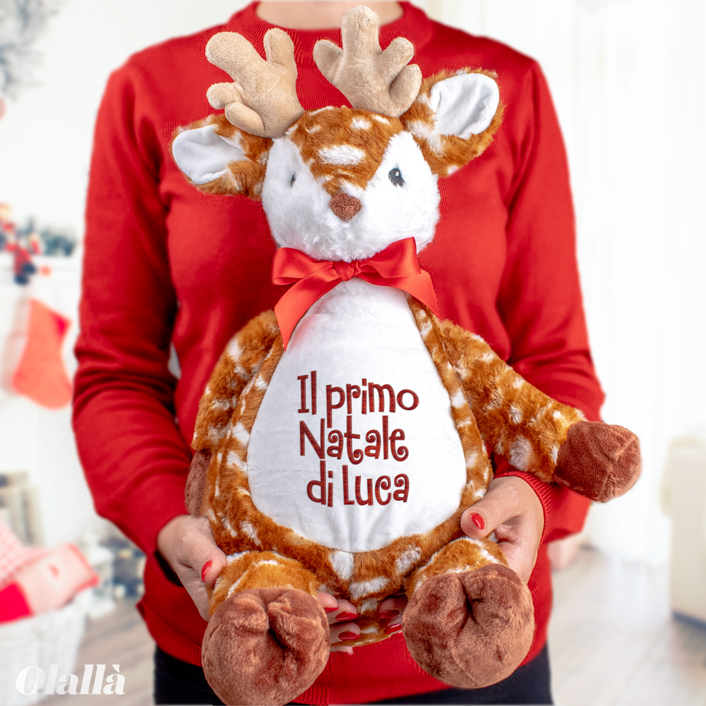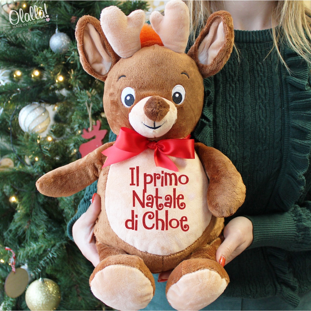 Dolcissima renna peluche con fiocco e scritta “Il primo Natale di” personalizzabile col ricamo del nome del piccolino a cui lo vuoi regalare. Un dolcissimo regalo per il primo Natale del tuo cucciolo, con cui giocare e condividere i momenti più belli.