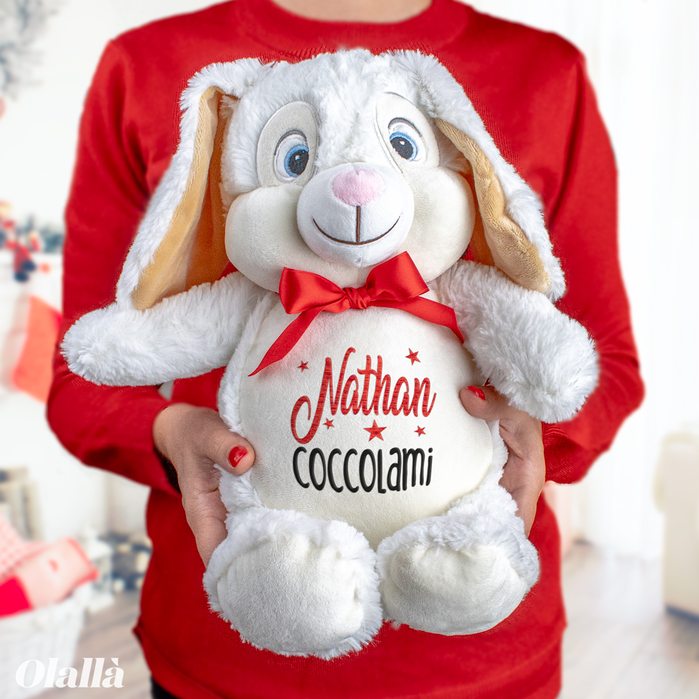 Belissimo e morbidissima peluche personalizzato con il nome del tuo bimbo e “coccolami”. Il regalo originale che porterà tanta gioia e allegria sia al piccolino sia ai suoi genitori!