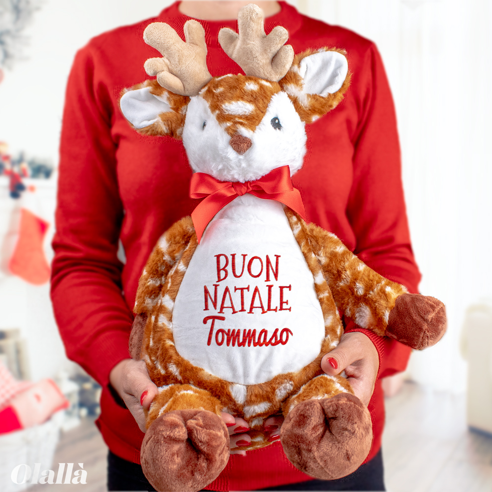 Dolcissima renna peluche natalizia a quadri e pois con scritto “Buon Natale” sul pancino e personalizzata col ricamo del nome del tuo piccolino. Il regalo di Natale perfetto per far felici i tuoi cuccioli !