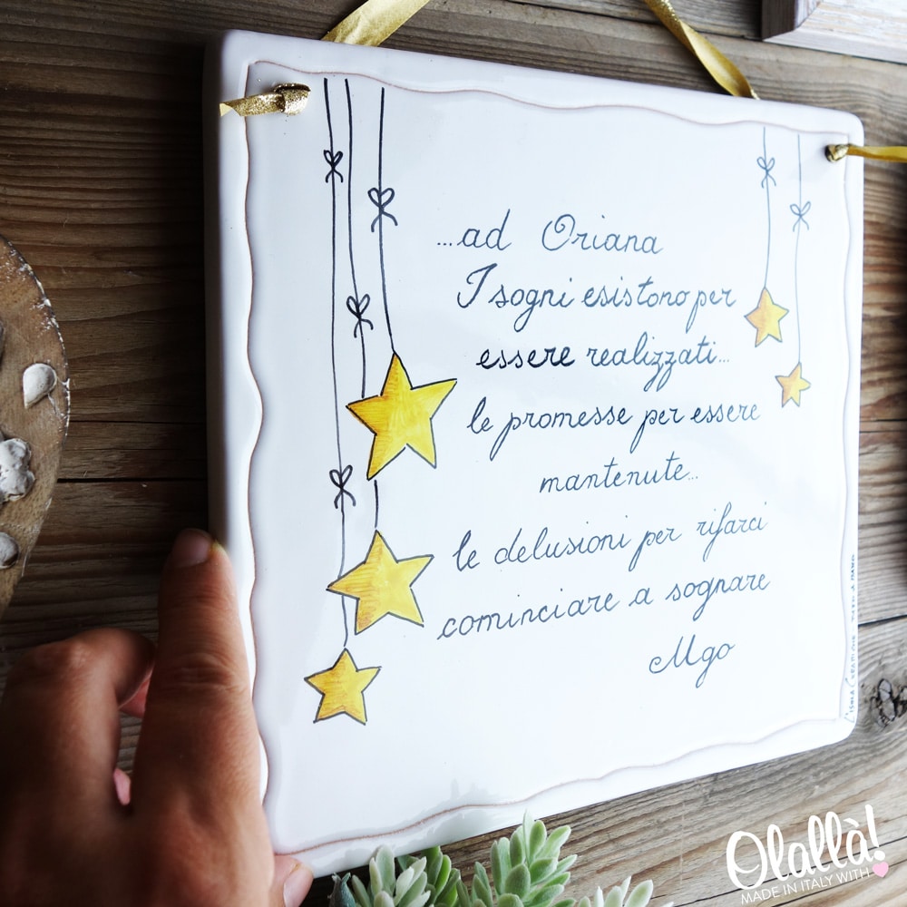 Semplice ma d’effetto, targa in ceramica dipinta a mano con decoro stelline e il tuo messaggio speciale.