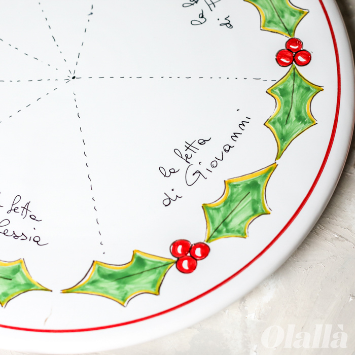 Il piatto da torta è pensato per essere personalizzato con la divisione in fette di torta di varie grandezze, in modo da poter assegnare a ciascuno la sua fetta, piccola, media o grande. Rimane invece invariata la decorazione con le foglie e bacche di vischio.