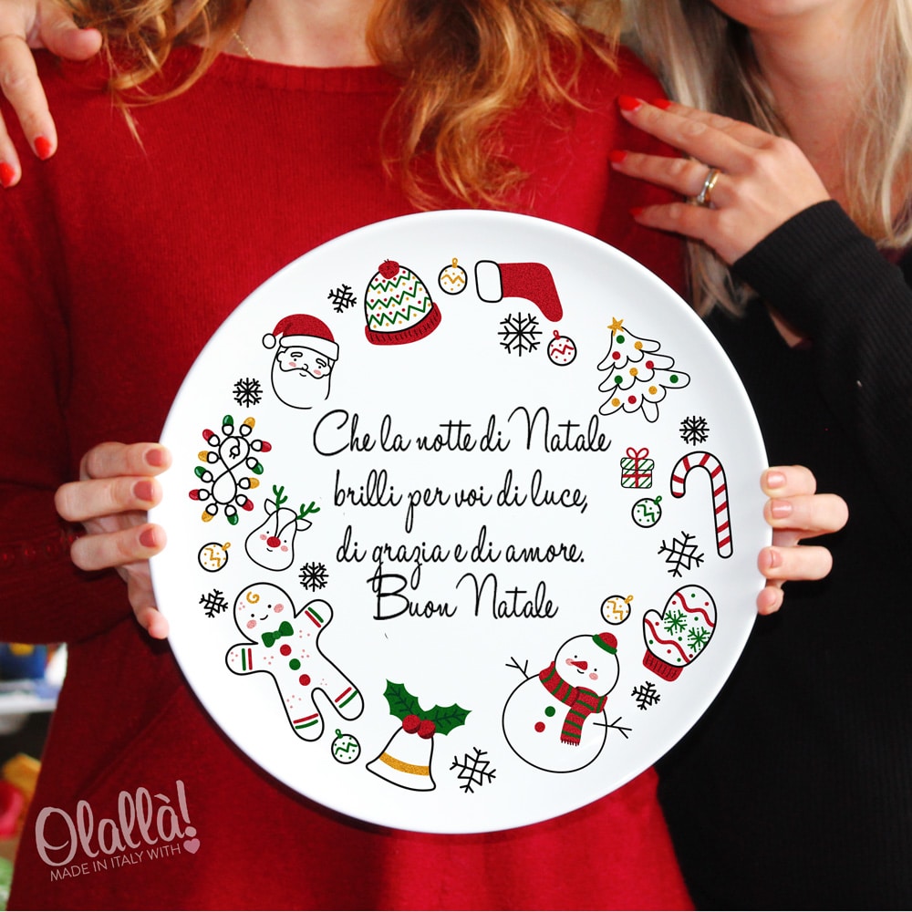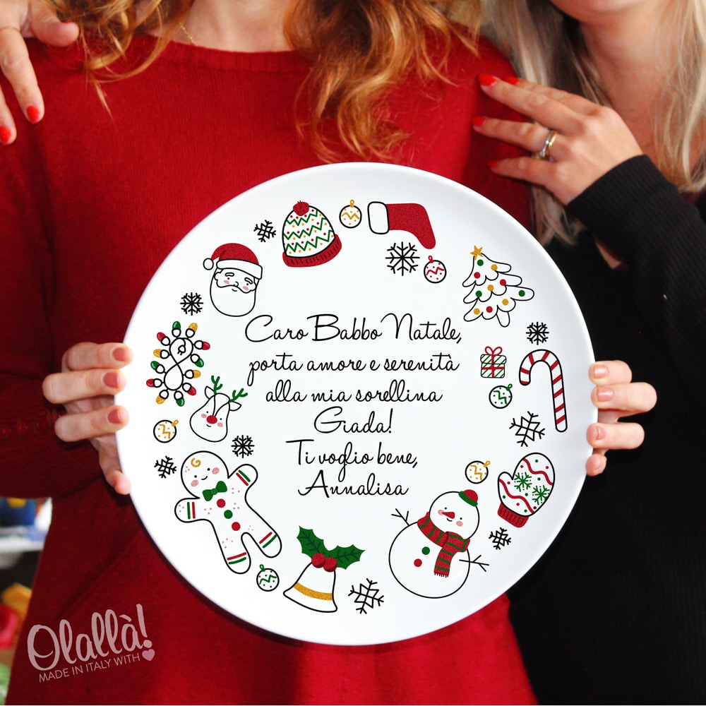 Piatto in ceramica decorato con meravigliose decorazioni natalizie personalizzabile con una frase a vostra scelta! Unico ed originale, è perfetto come regalo di Natale da trovare sotto l’albero e da usare durante i pranzi natalizi!