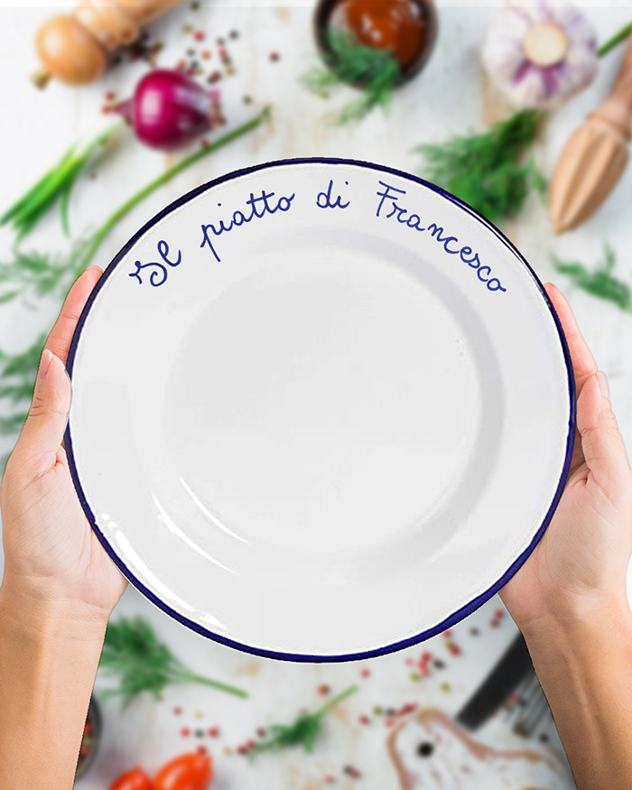 Piatto in ceramica bianco con rifiniture blu e scritta personalizzabile. Un’idea regalo perfetta per il Natale o per il compleanno di chi ama cucinare. I piatti assumeranno tutto un altro sapore!