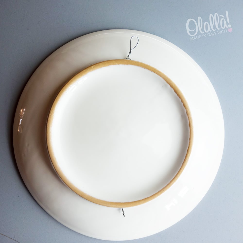 Diametro 30 cm (in questo caso la ceramista aggiunge una cornice dipinta tutto attorno secondo le tue richieste)