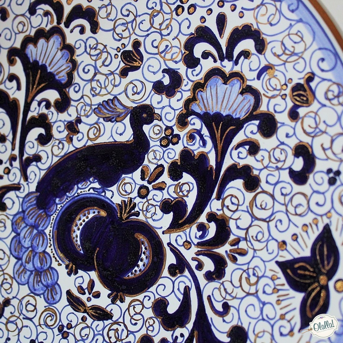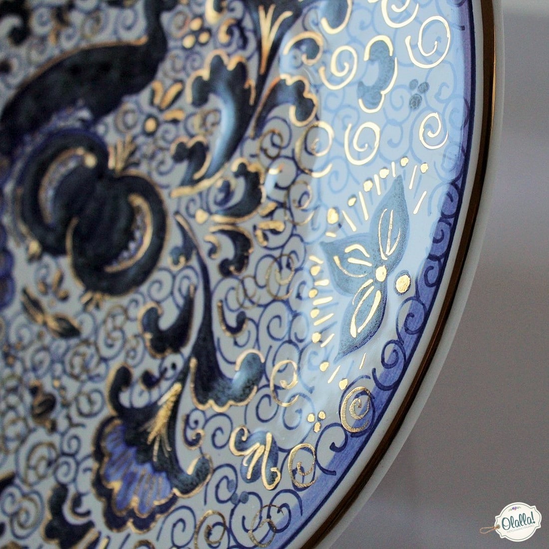 Splendido e prezioso piatto decorativo in ceramica con disegno di pavone e ricami in oro. Questo piatto impreziosirà il vostro arredamento come splendido centrotavola o appeso alla parete. Un regalo importante e splendido per tutti gli amanti delle cose belle, nel segno di una delle grandi tradizioni ceramiche italiane.