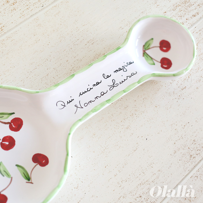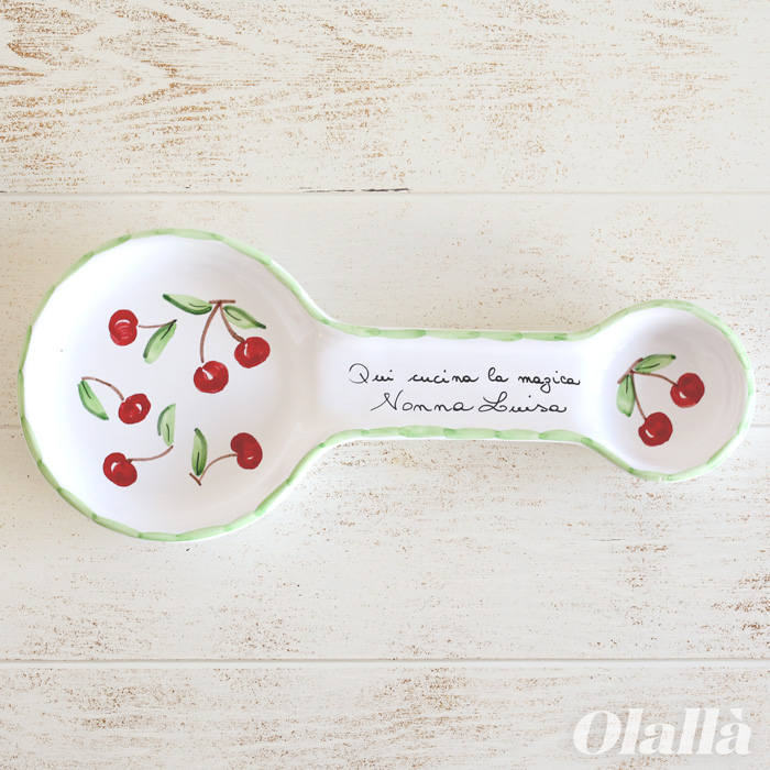 Poggia cucchiaio grande in argilla rossa smaltata di bianco, dipinto a mano.