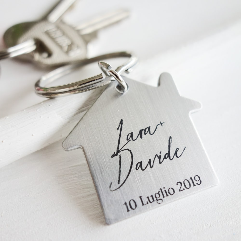 Splendido portachiavi in acciaio inox personalizzato con i vostri nomi e la data di inizio di convivenza o di acquisto casa. Un’originale idea regalo da fare per celebrare con un piccolo oggetto il vostro grande traguardo.