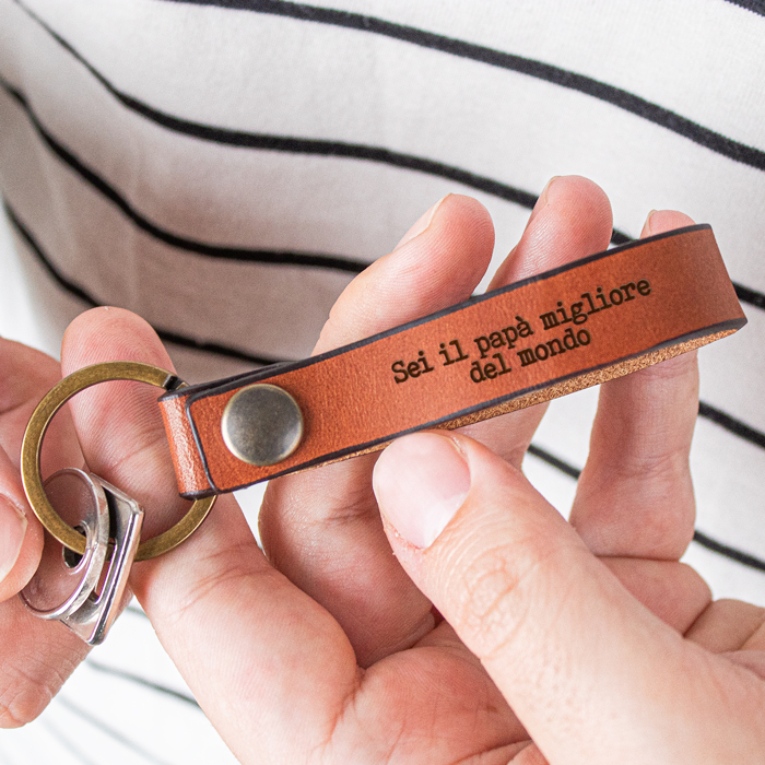 Questo portachiavi in cuoio diventerà un esclusivo regalo per tuo marito o compagno che apprezzerà di ricevere un dono utile oltre che bello e unico, realizzato su misura per il papà del tuo cuore o il papà dei tuoi figli. Pratico e di stile, questo portachiavi è disegnato per poter essere portato alla cintura, si mette e si toglie facilmente grazie al pratico bottone automatico e ha un pratico anello dove appendere le chiavi. Un accessorio fondamentale per tenere ordinate le chiavi e per personalizzare il proprio stile.