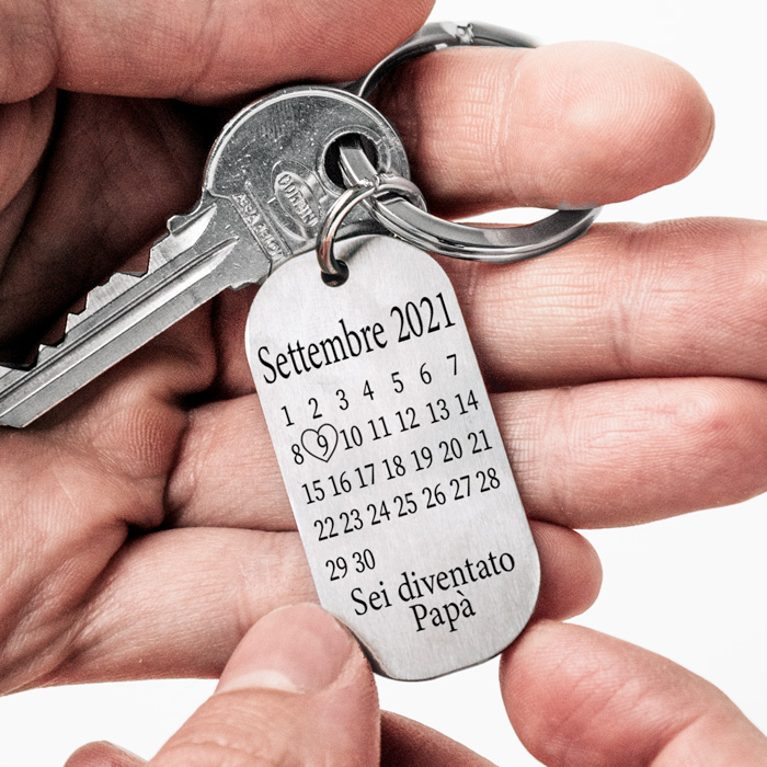 Splendido portachiavi in acciaio inox personalizzato con un calendario che indica la data di nascita del figlio. Un’originale idea regalo che farà commuovere il neo papà nel giorno della sua prima festa.