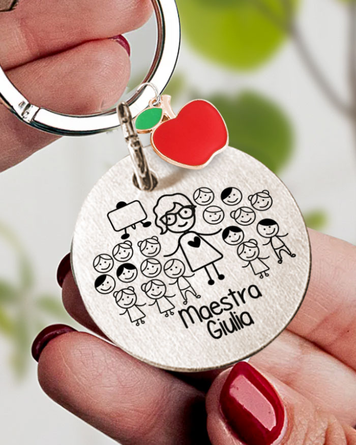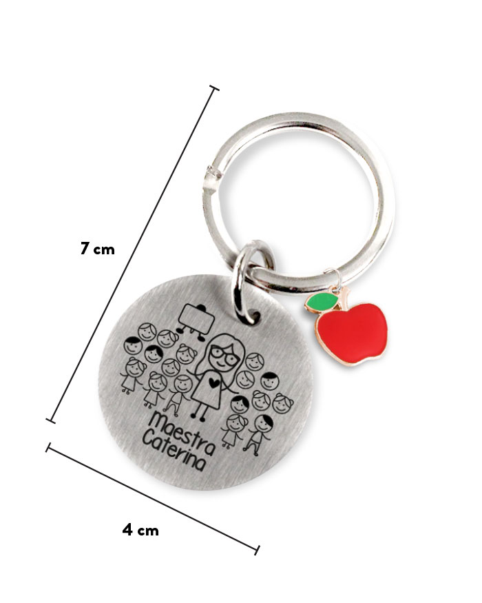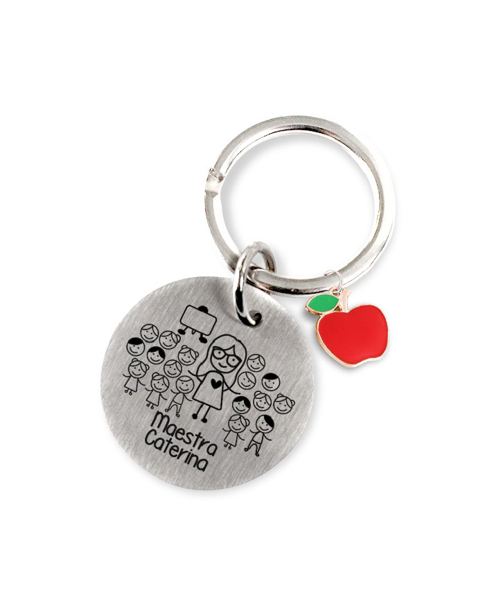 Portachiavi in acciaio personalizzato con ritratto stilizzato della maestra con nome e charms colorato a forma di mela.