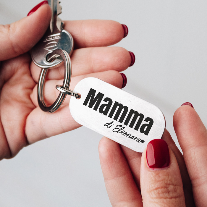 Elegante portachiavi per la mamma in acciaio inox personalizzato con i nomi dei figli e il cuoricino. La scritta “mamma” resta fissa, è possibile scegliere i nomi da inserire. Un’originale regalo che farà commuovere la tua mamma nel giorno del suo compleanno o della festa della mamma… Così vi porterà sempre in tasca, ovunque vada!