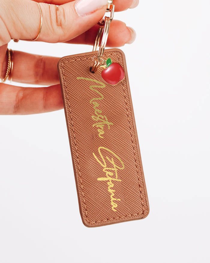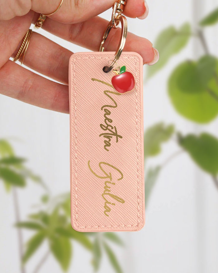 Portachiavi rettangolare in ecopelle con l’iscrizione “Maestra”, arricchito con il nome personalizzato.