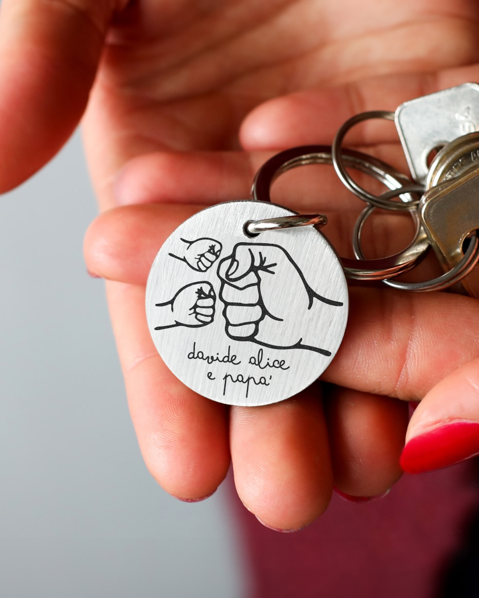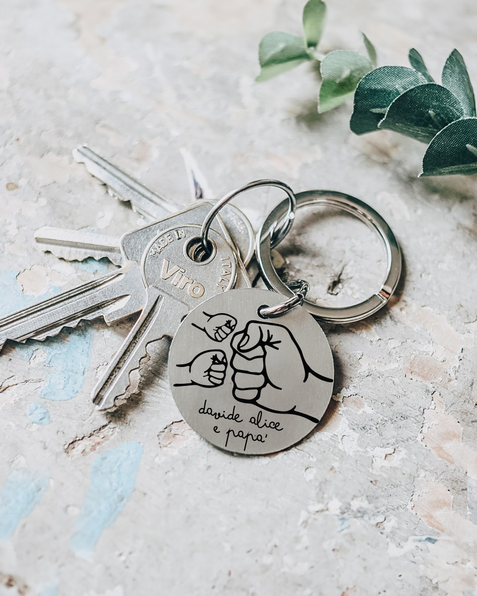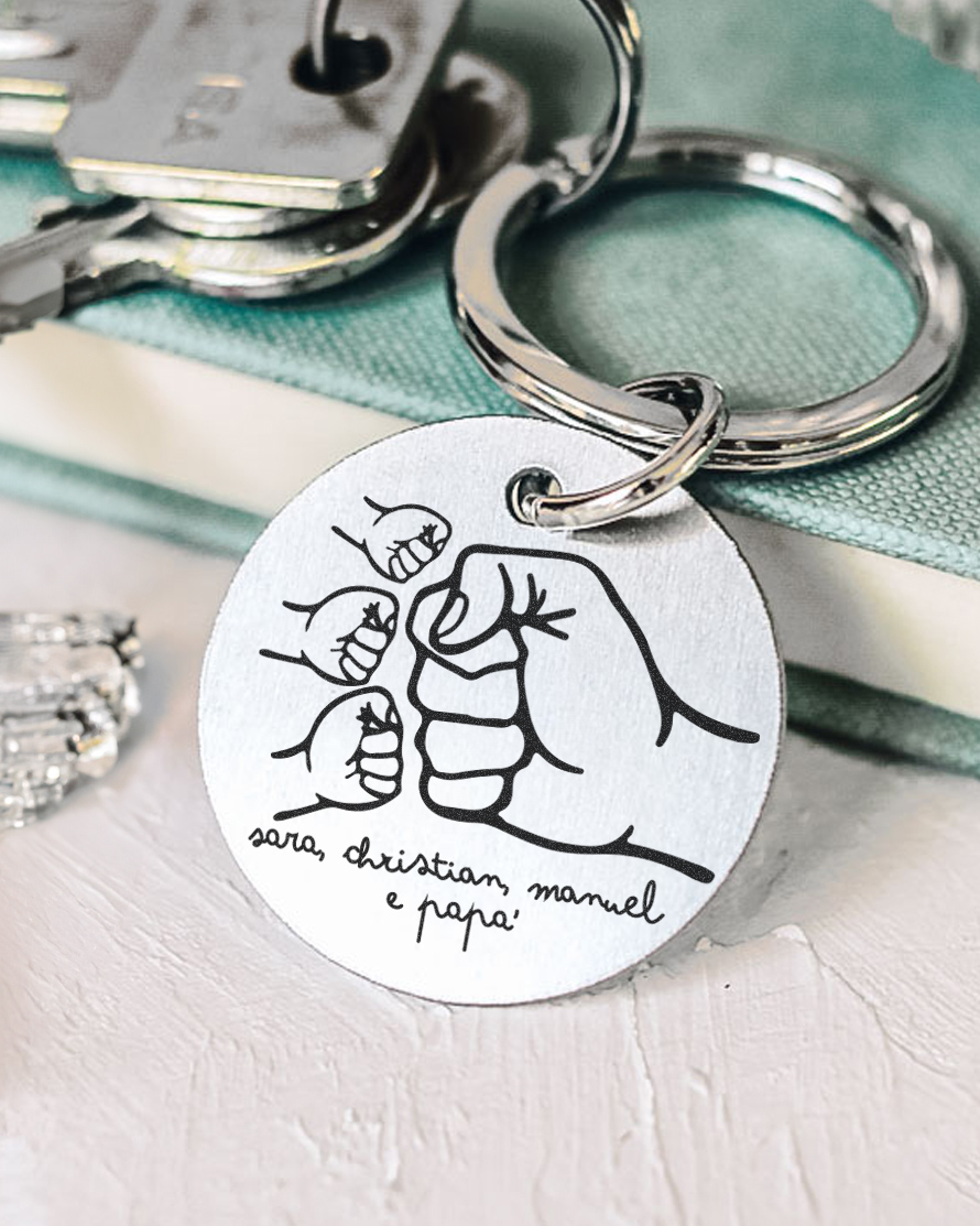 - Ricchezza Affettiva: Questo non è un semplice portachiavi. È un simbolo dell’amore che lega un padre ai suoi figli. La personalizzazione con i pugni e i nomi trasforma questo oggetto in un dono carico di emozioni e significati.