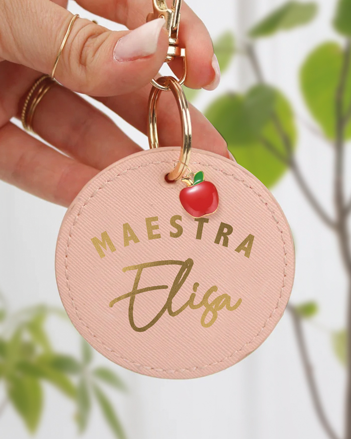 Portachiavi Tondo in Ecopelle “Maestra” Personalizzato con Nome – Idea Regalo per Maestre e Insegnanti, Fine Anno Scolastico
